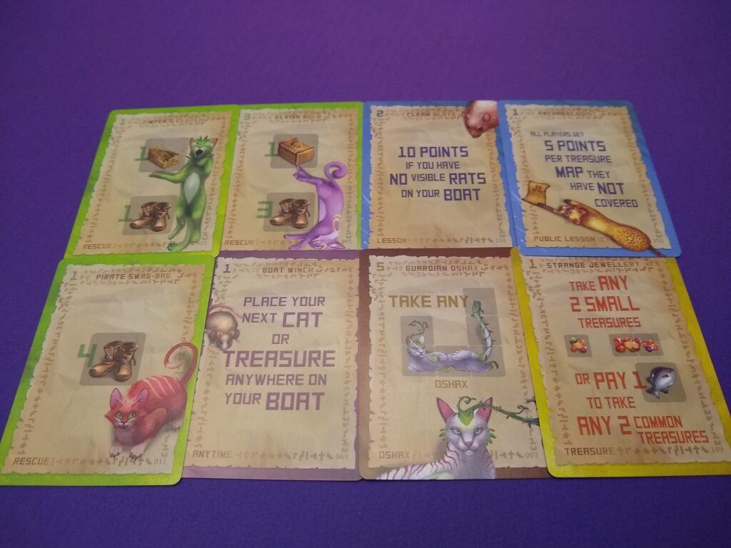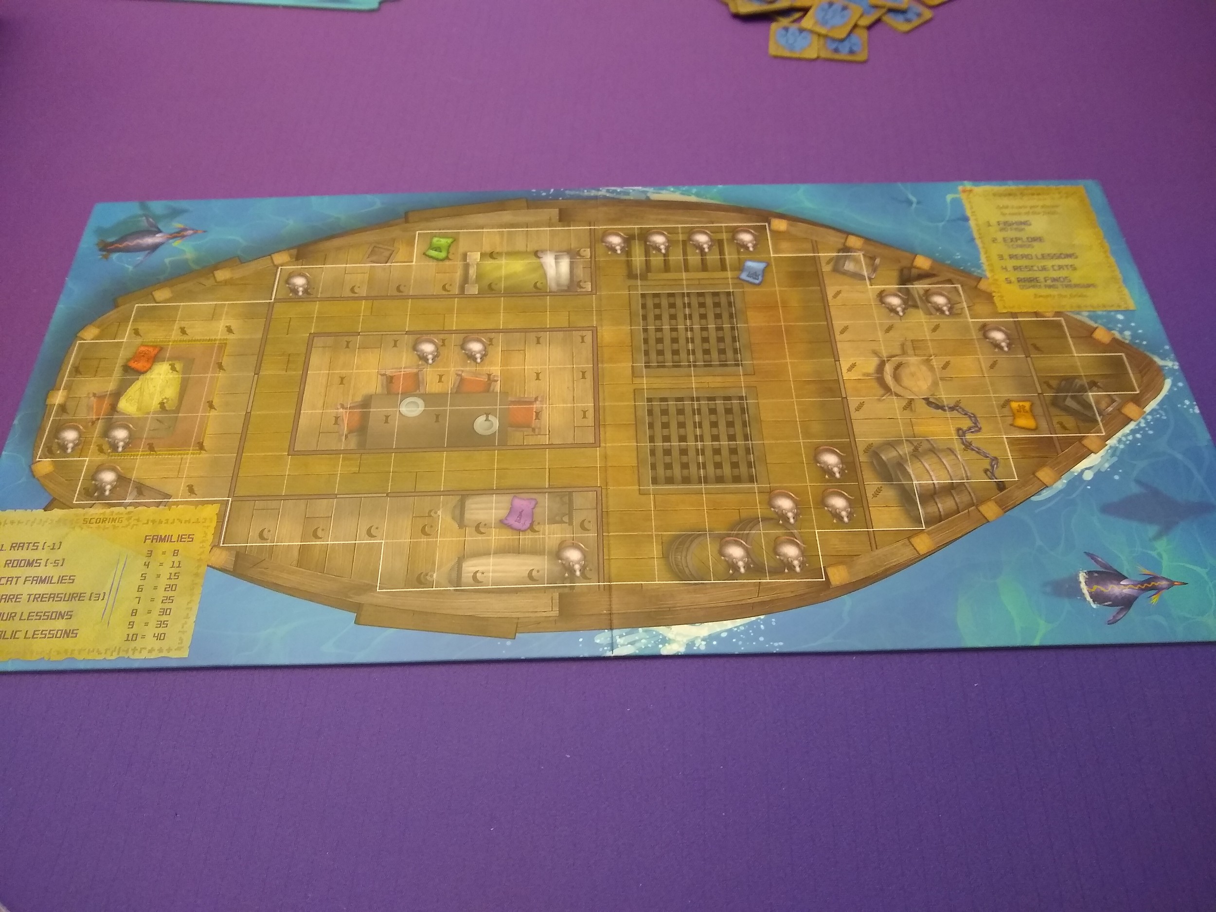 Solo Mode – In solo mode you play against the game-character of your sister who collects cats and treasures, but does not have a boat. The AI will have a speed, which will determine turn order, and a certain number of baskets which will allow her to collect from the available cats and treasures. The AI will score points at the end for cats and lessons based on what is in your boat though, so it is important to pay attention to which cats are most valuable to the AI, and what lessons they have, so that you aren’t necessarily letting the AI score a lot of points for them. Very puzzley, and a nice, smooth flow that works well.
