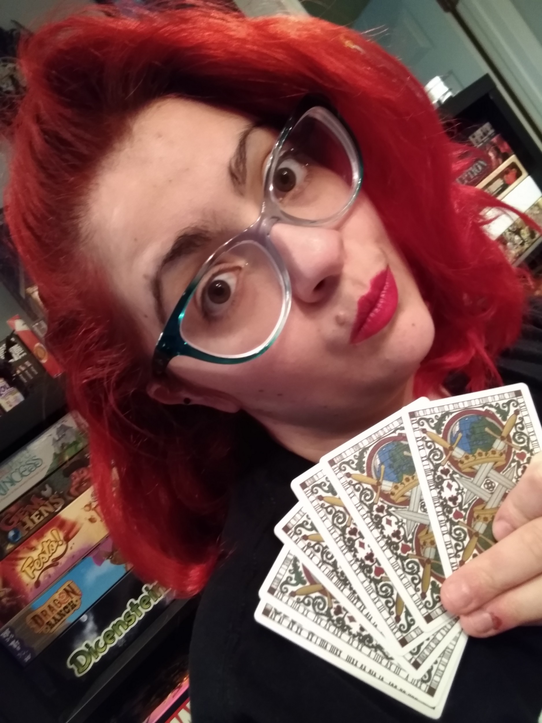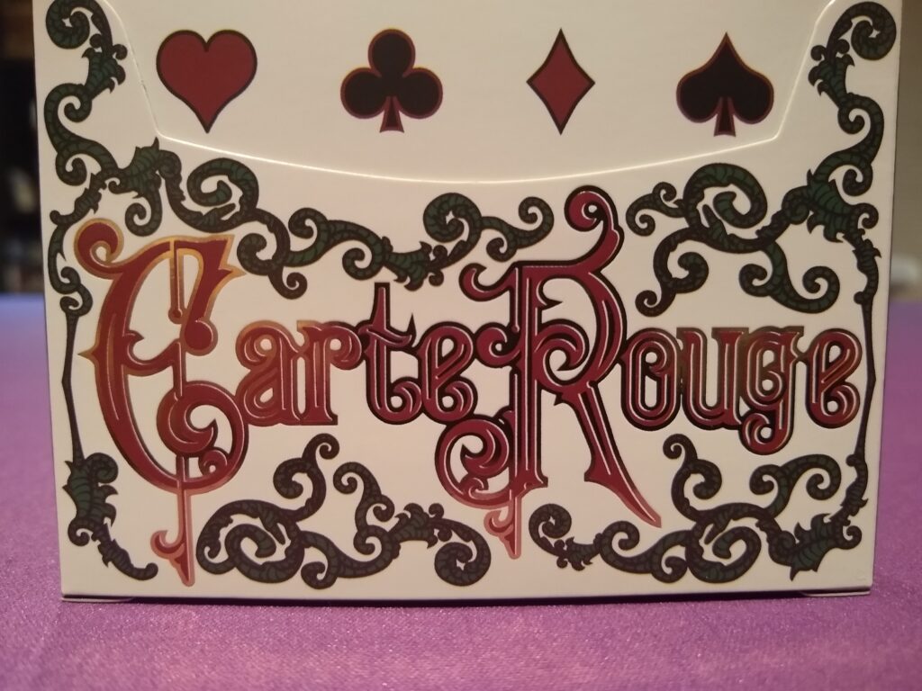 The game is just 55 cards (52 card deck, 2 jokers, 1 “letter” from the person sending you the deck). They’re nice quality cards, with a nice finish on them; everything you need to read/see is clear – though it is fairly small, so if you’re eyesight’s not great, you may want to grab a magnifying glass. The deck box is average cardboard, but with some really nice gold lettering and designs. Cute and compact!
