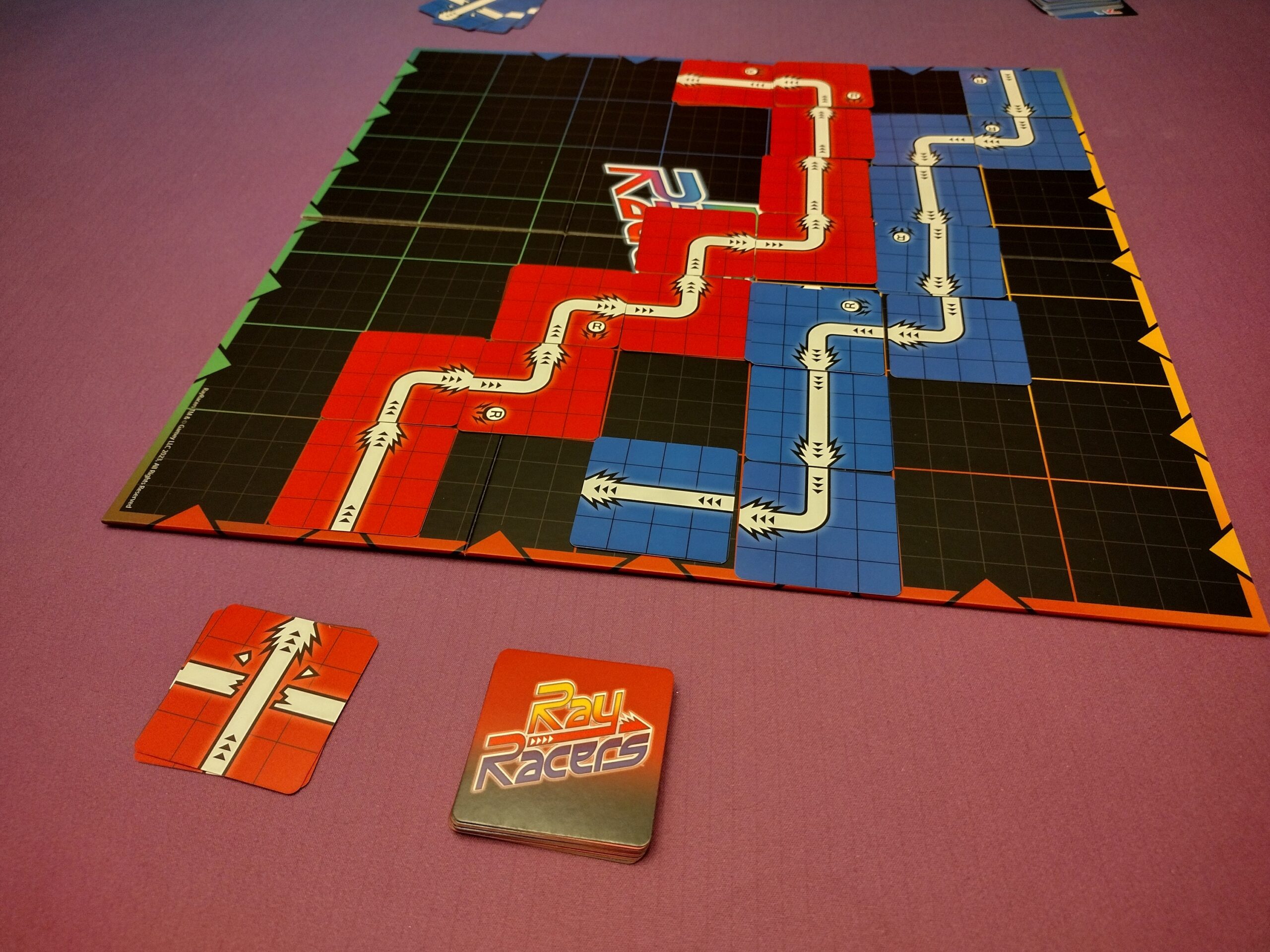 Tile Placement – Each round, players will simultaneously play one to three of their Ray-Line cards to extend their path. Breakthru cards can be used to go through another player’s line, when possible, to avoid crashes. Reverse cards can be played on top of another card to change the direction your line is headed.