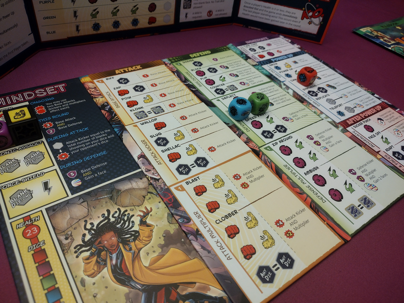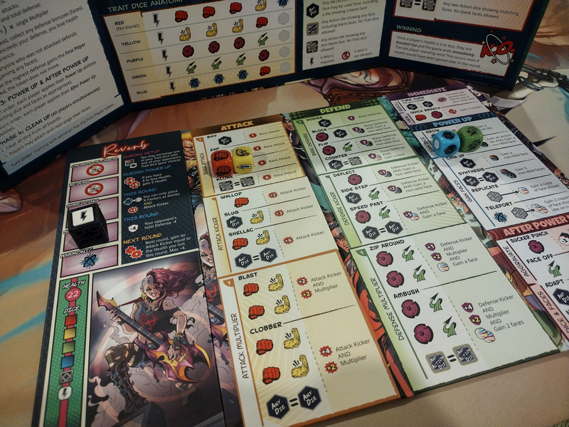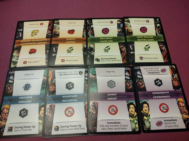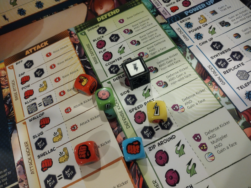 Pool Building / Dice Rolling – Players start with a pool of dice based on their chosen character, and can earn more trait dice (with pre-determined symbols) and action dice (buildable dice with customizable faces) during the game by “powering up.” Each round players simultaneously roll these dice and choose what actions (attack, defense, et cetera) they want to trigger in the coming round.