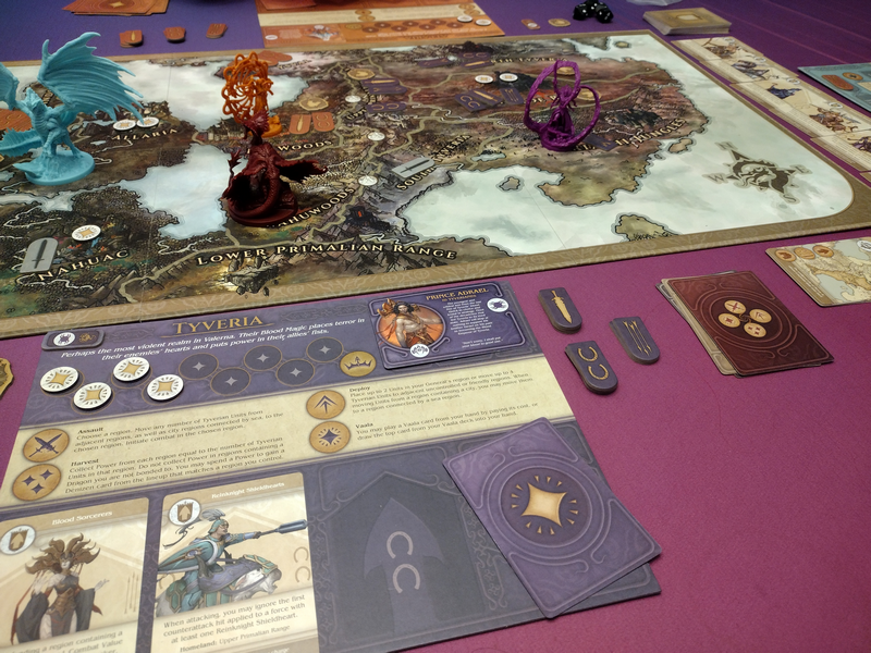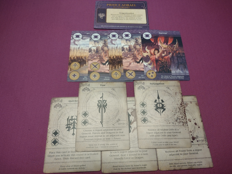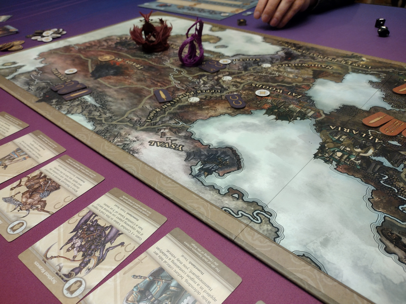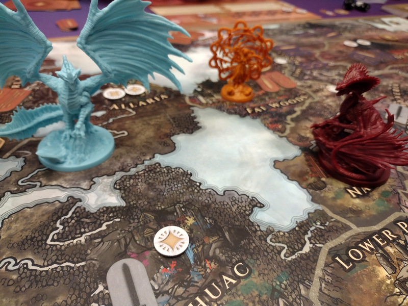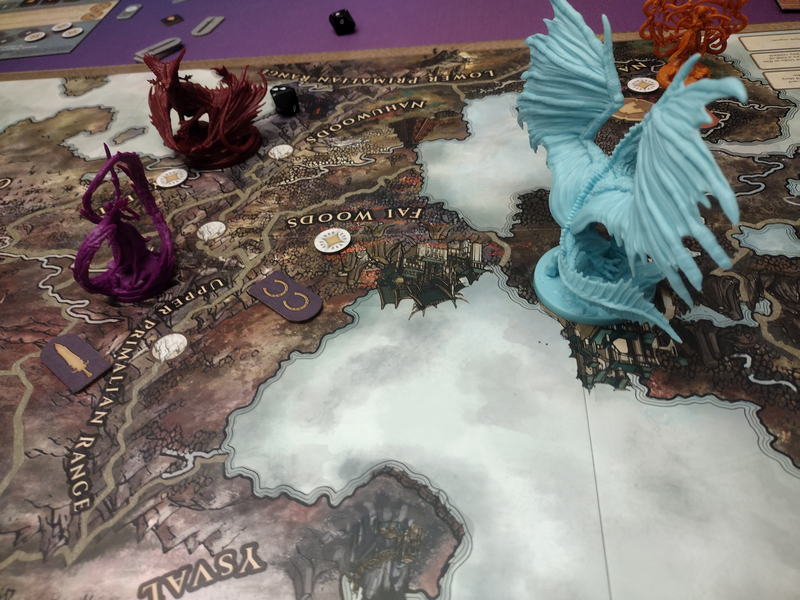 Combat – Players can attack one another while moving around the board. Dragons have strength depending on how many wounds they have, and generals’ strength comes from the units in their region. Players will roll combat dice to determine the outcome.