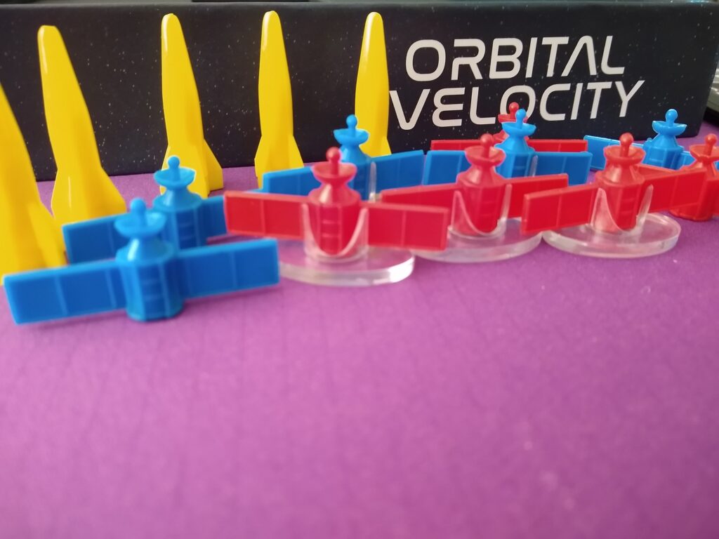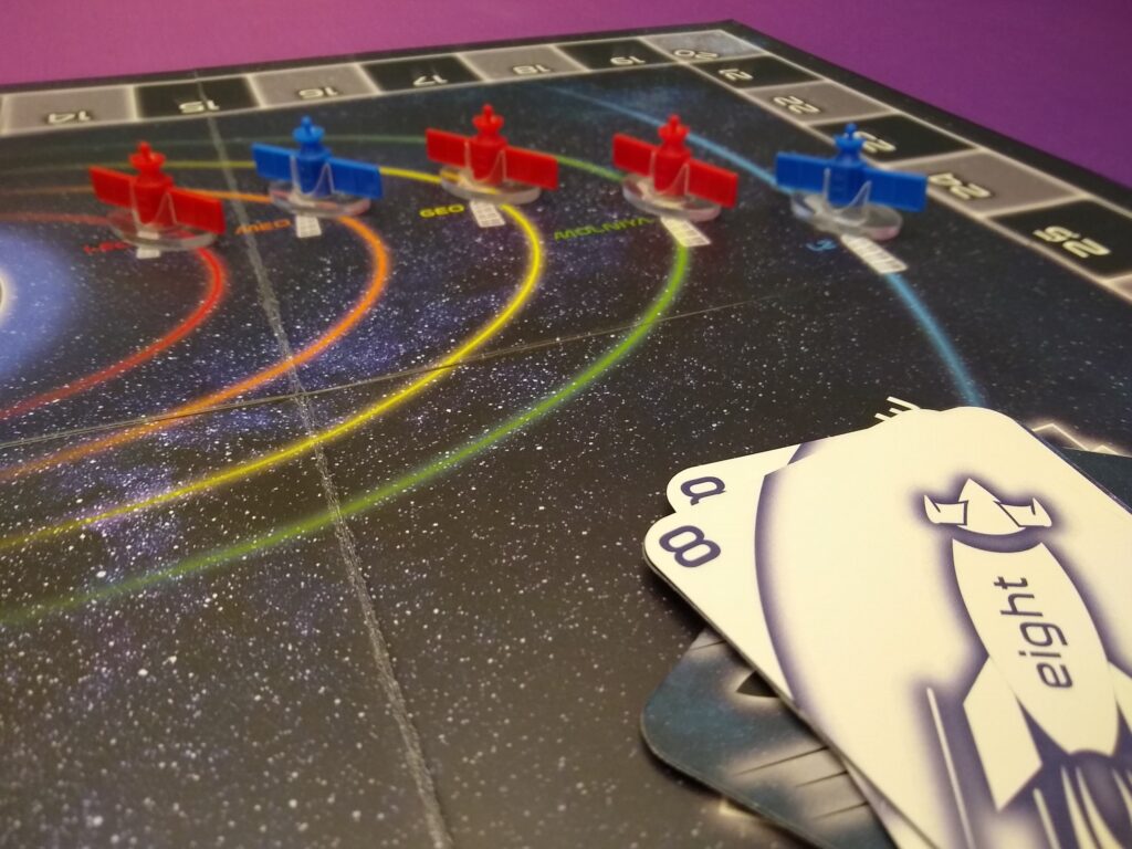 Some nice components in this game – the rockets, satellites, and satellite holders are all nice quality plastic pieces, the satellites also slot into the holders with ease. The game board is sturdy quality, simple but attractive look, and all the spots are clear.