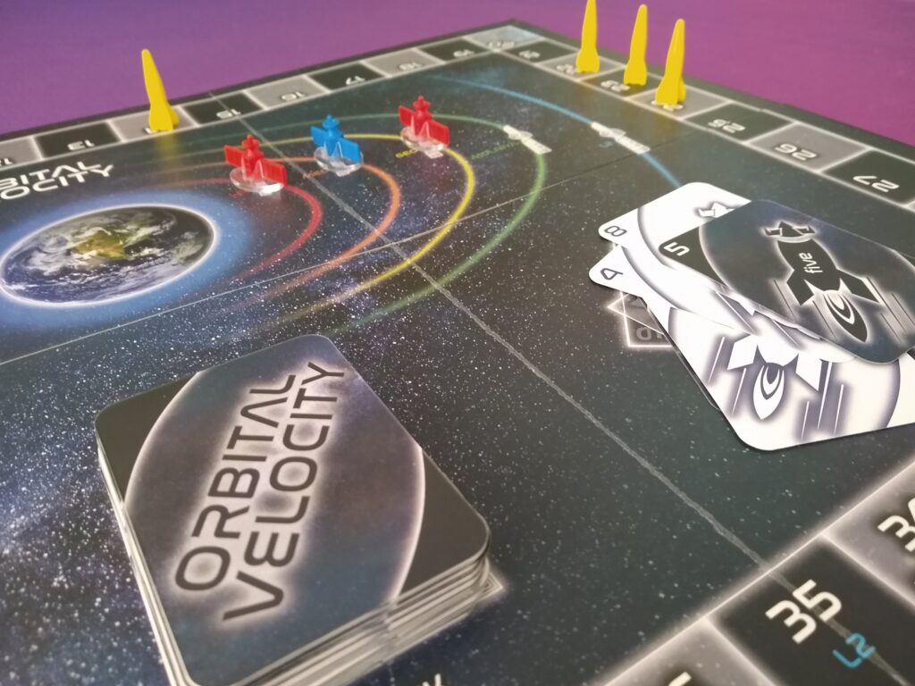 The game is easy to learn, doesn’t take long to play, and has a smooth flow. Unfortunately, even with knowing how many of each number/decelerate cards are in the deck, it still felt heavy on the luck. There’s a little strategy in what you choose to play when, but sometimes you’re left with no choice other than to set your opponent up in the scoring area. I can see families or younger gamers enjoying this because of its simple nature, or even see it being used in science classes as an example of orbital velocity. It wasn’t great for me, but I definitely think others out there will enjoy it.