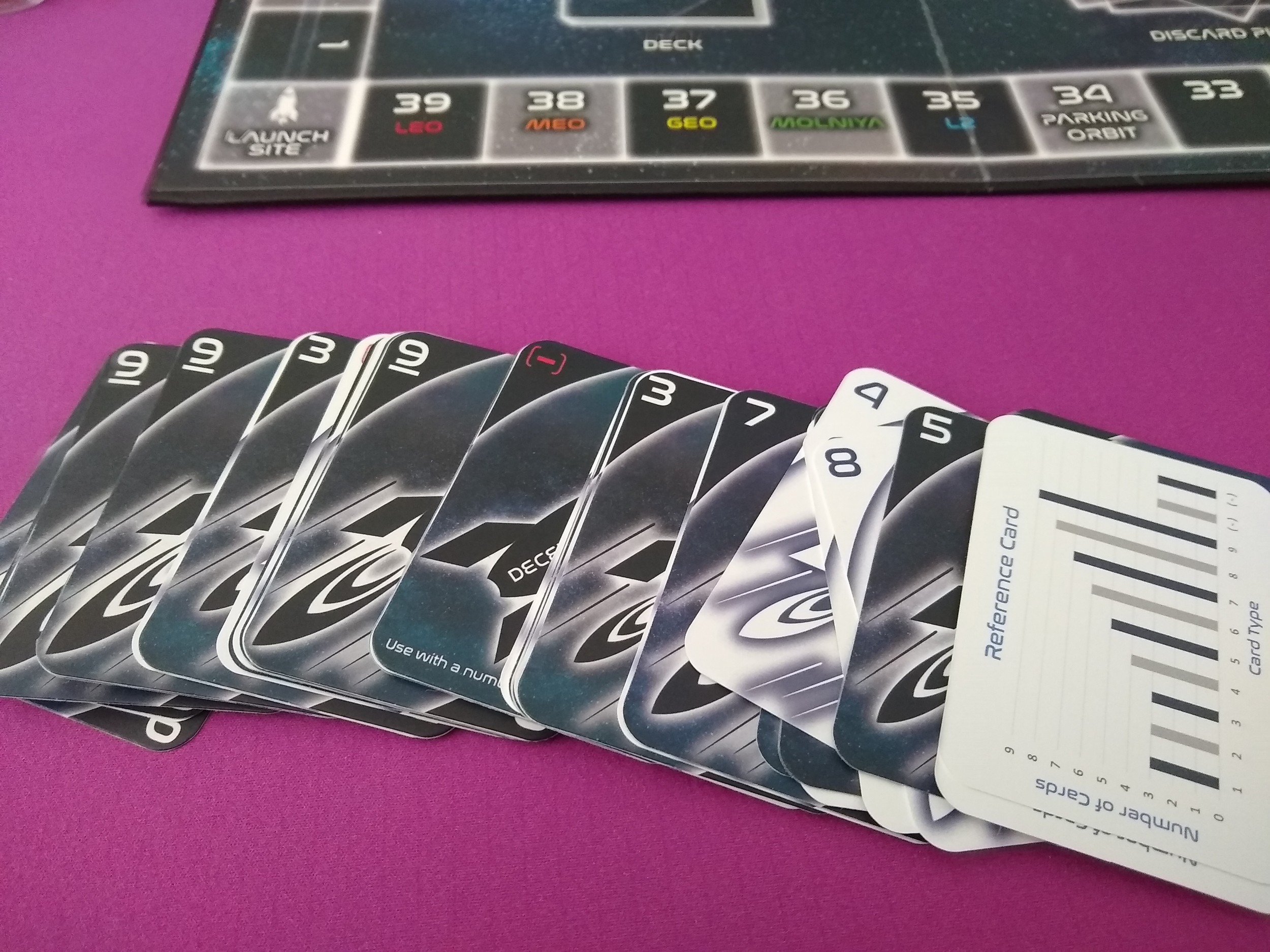 Advanced – Adds the EMDrive rule – you can play double cards (i.e. two 5’s) to move double the number of spaces (so you’d move a rocket 10 spaces with that example). Plus, it can stack with the “boost” rule from the regular game which is getting x2 movement if two rockets share a space before you move one (x3 if there are 3 rockets, et cetera). It’s not a huge change to the game, but it can make for some big moves if you get set up well.
