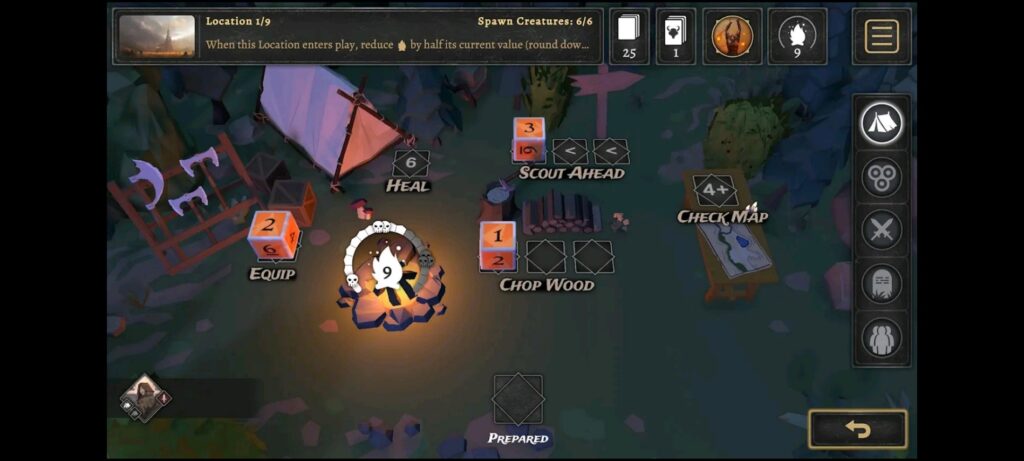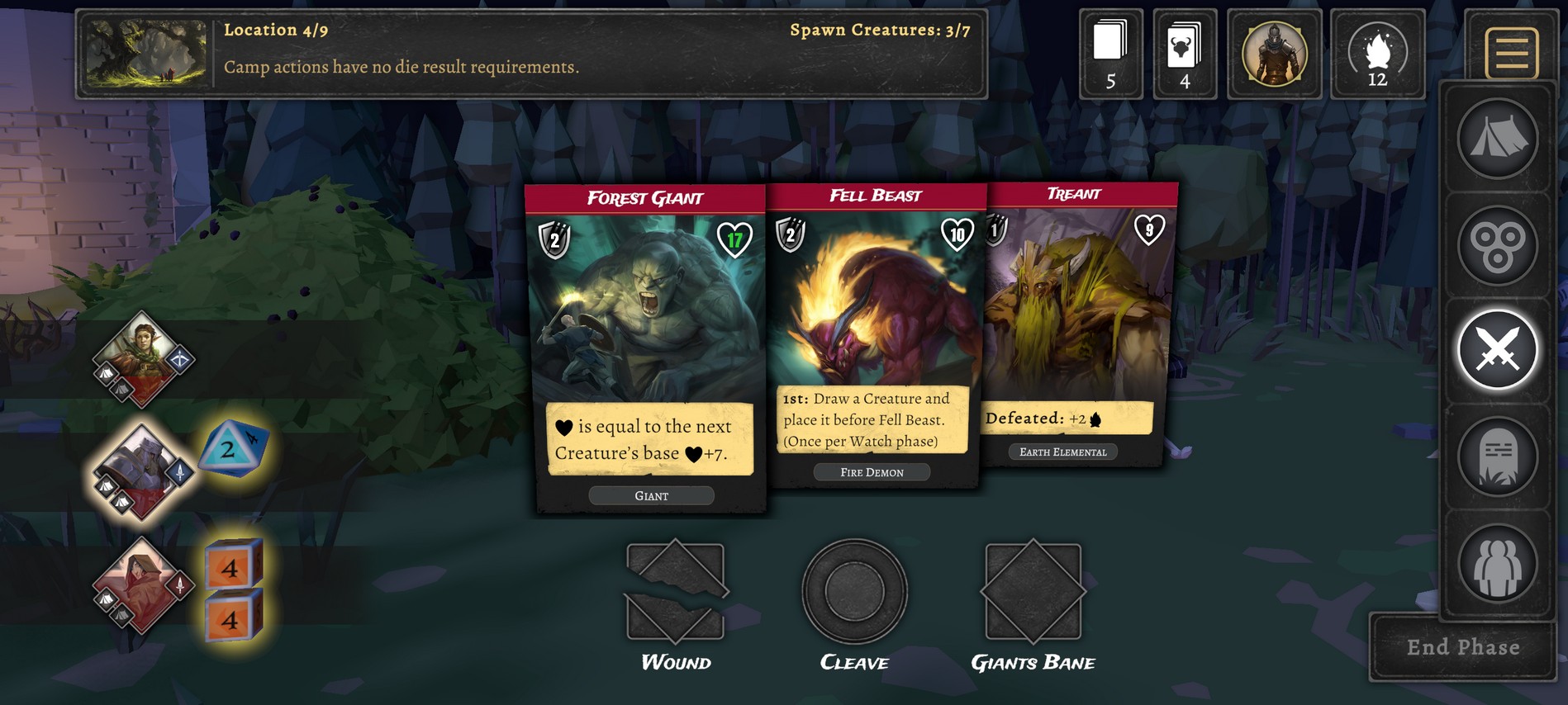 A digital edition of the board game. You’ll use 4 characters, each with different dice/abilities, and will use them to do camp actions (hopefully helping the characters that will be fighting) and go on watch (to defeat monsters). You win if you can make it through all the monsters thrown at you through multiple locations.