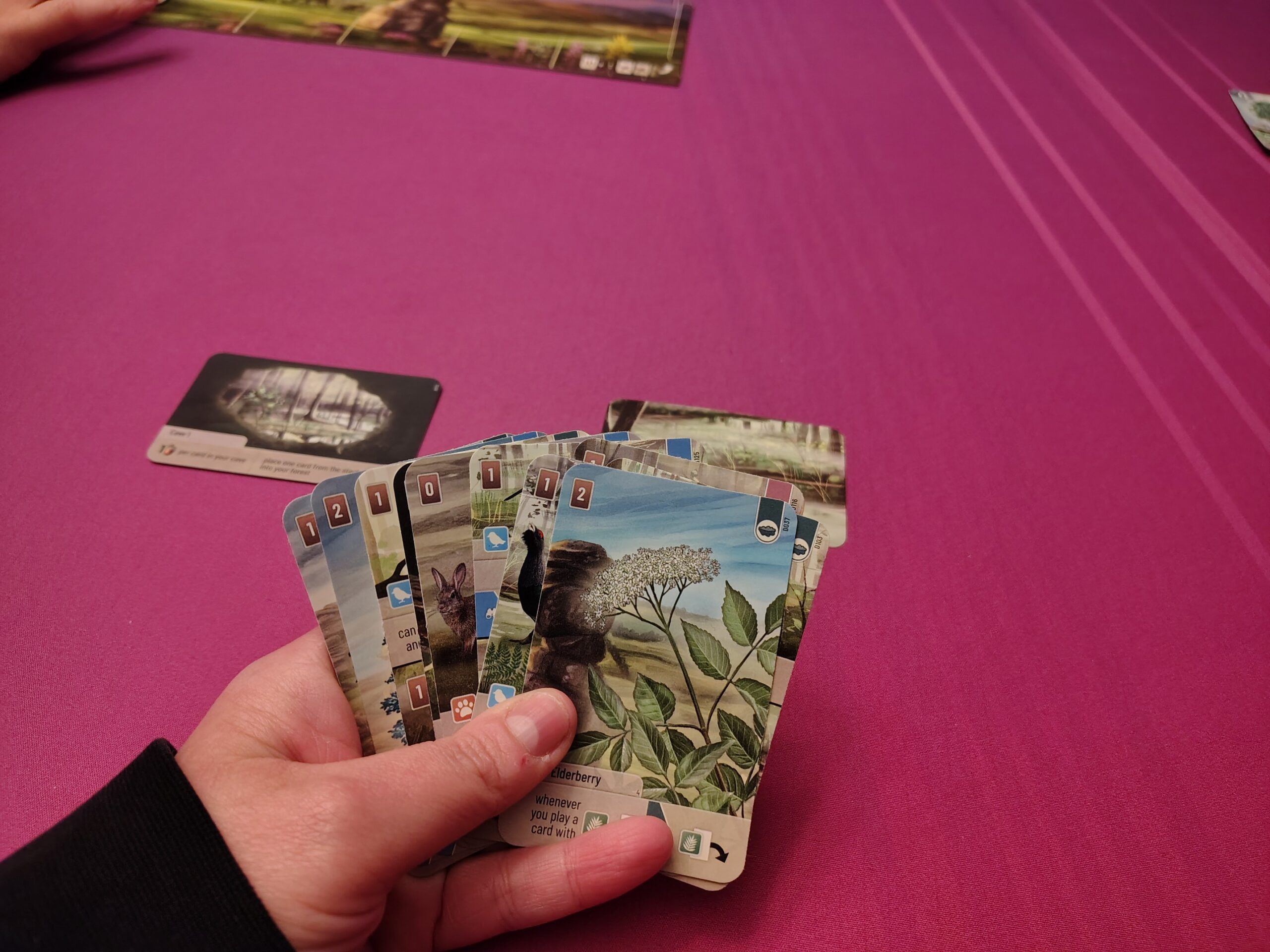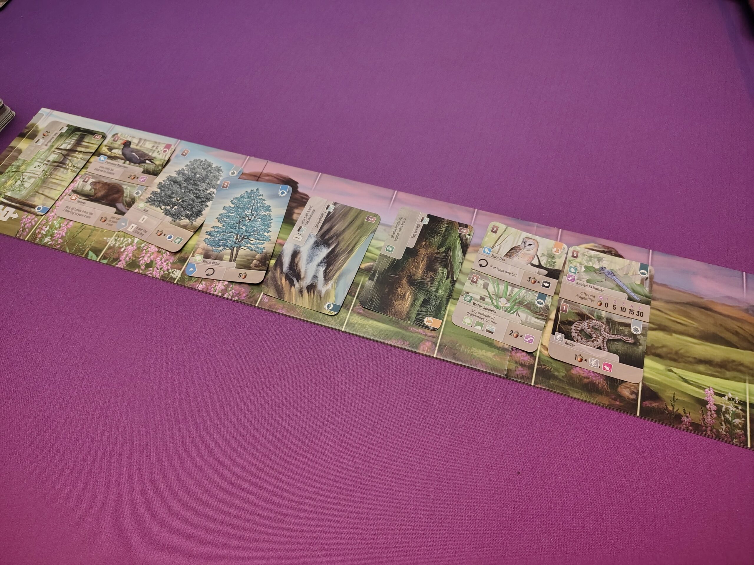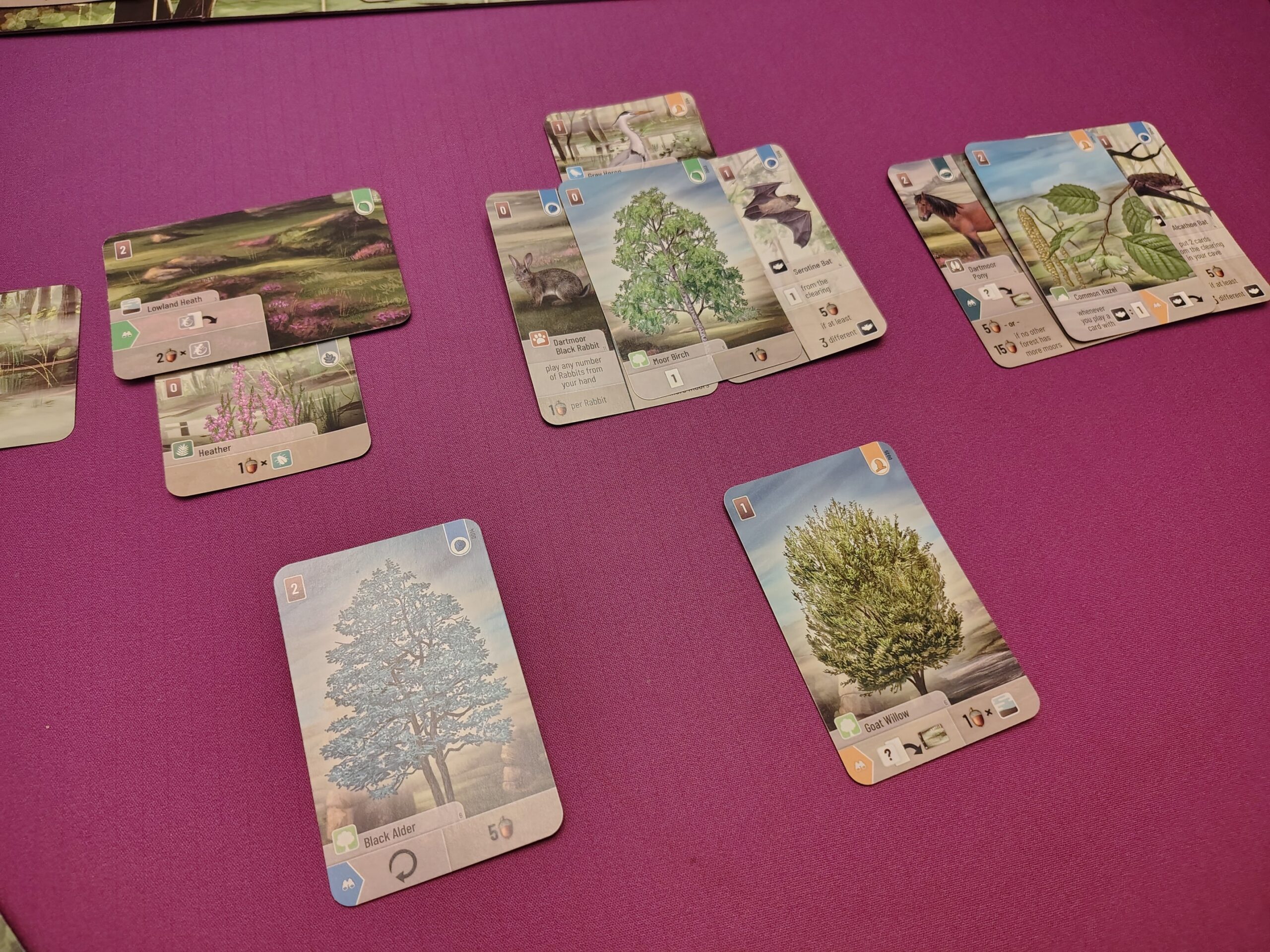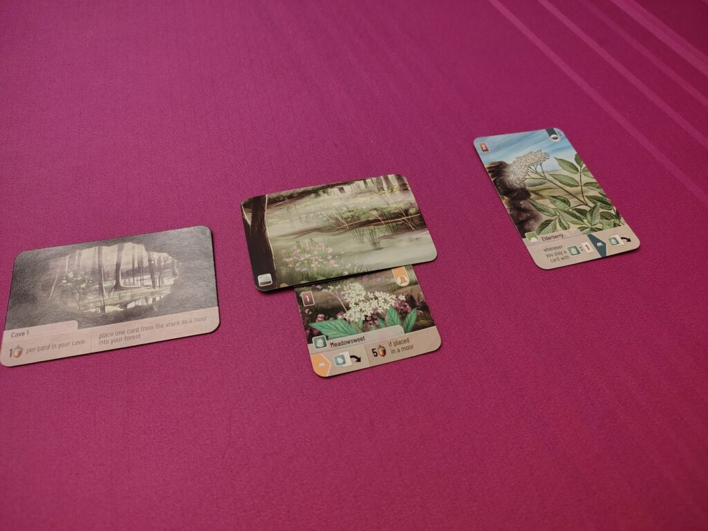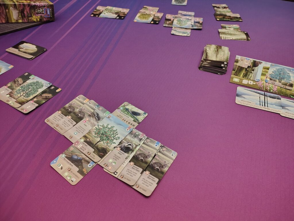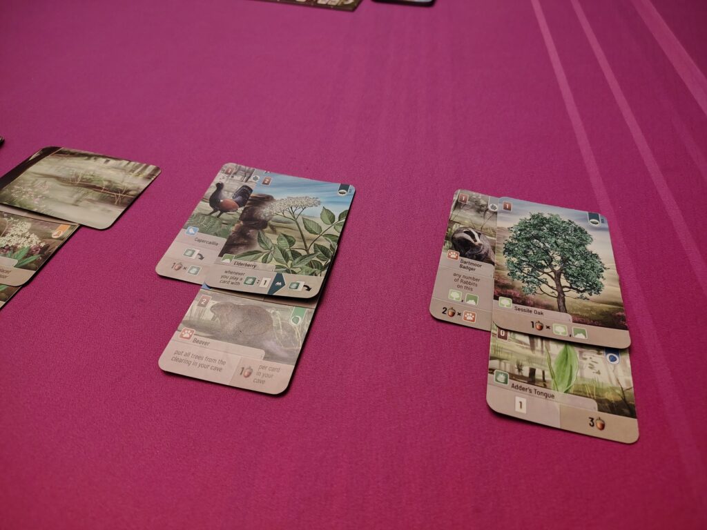 ⚙️Multi-Use Cards/Layering – When playing cards, players will need to “pay” for them with other cards from their hands. Sometimes, they will get bonuses for using certain types as payments. Additionally, Many cards are split – top and bottom or left and right – which give players options for what plants/animals to play to their forest. Cards will be layered to only show the sides players are actively using
