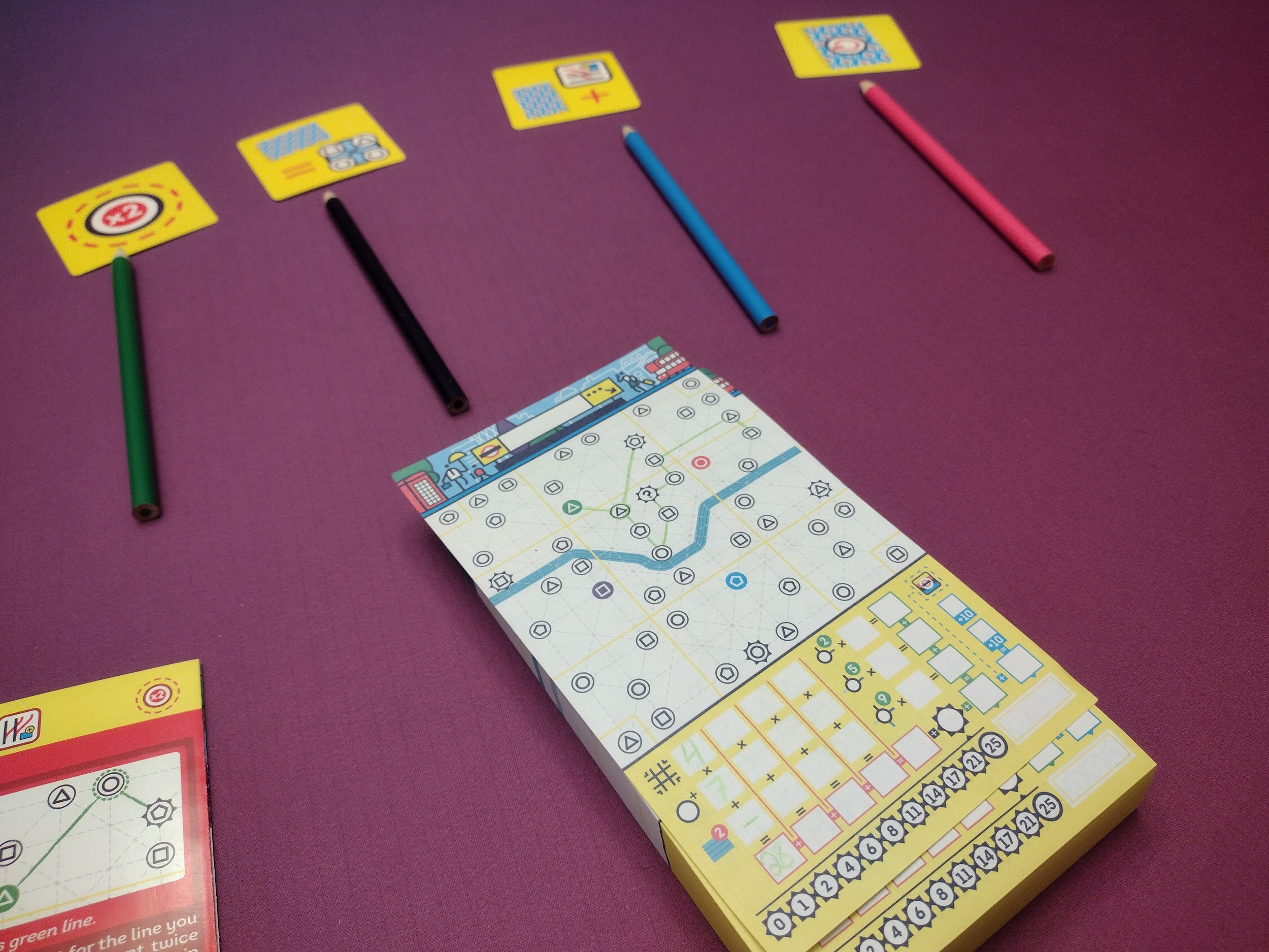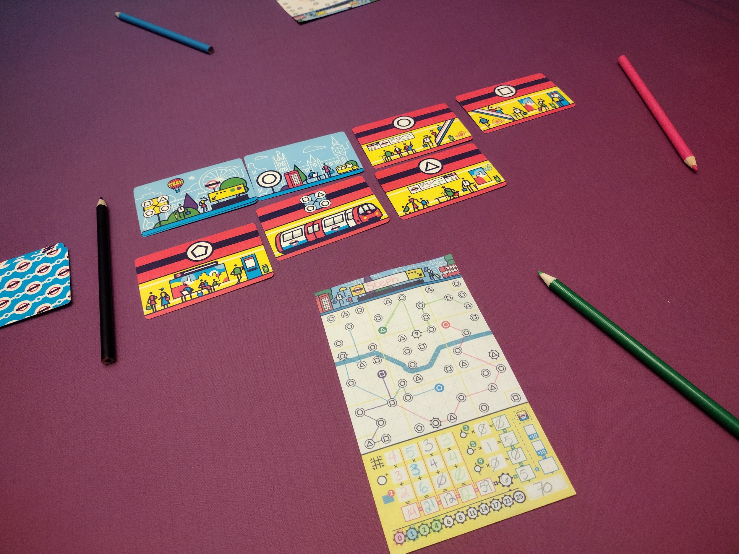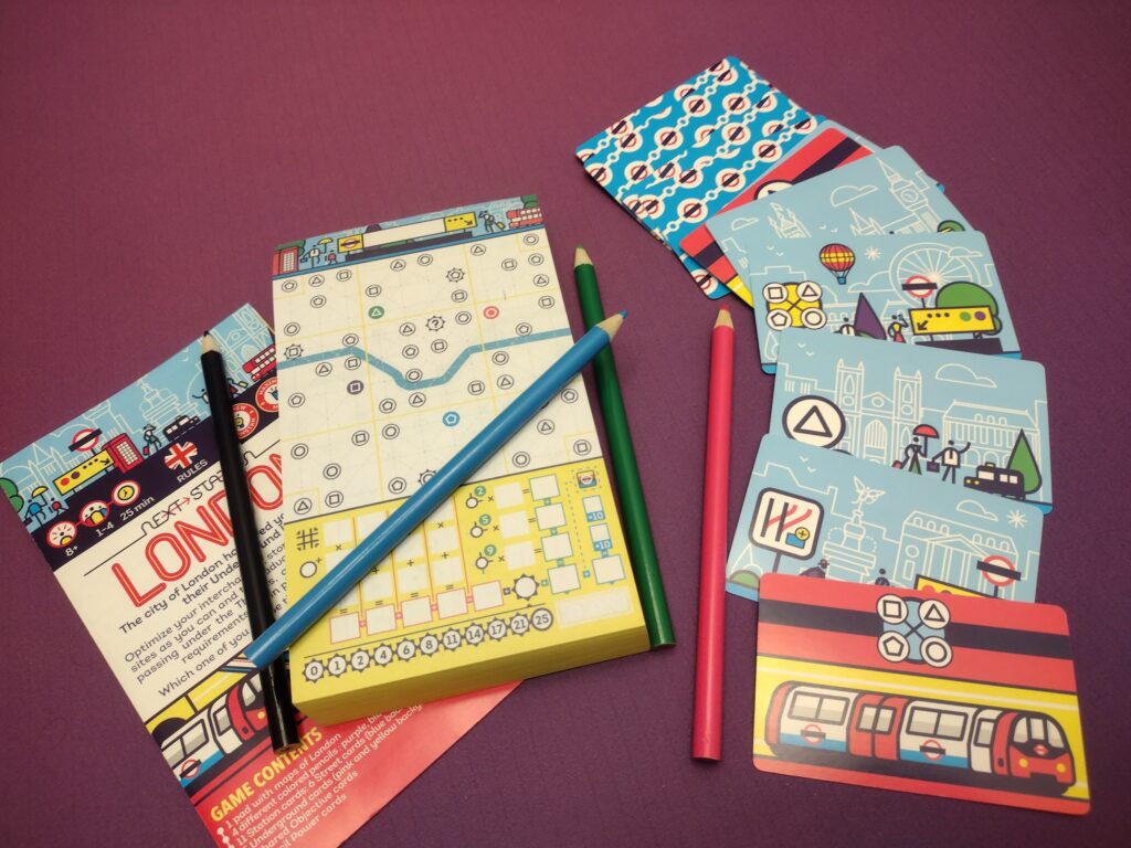 A flip & write game where players draw a different underground line each round, starting at a different departure station that matches their colored pencil for that round (total of 4 rounds/lines). Players score points for the districts and stations they hit on each line, how many times they cross under the Thames on each line, total tourist sites visited, and stations that link multiple lines. At the end of the game, the player with the most points wins!