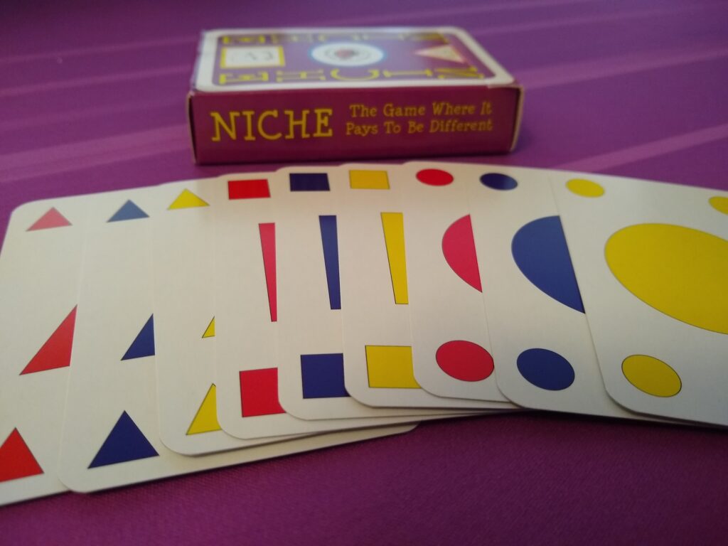 Hey gamers! If you’re into short & sweet card games that are simple to learn but still hold a bit of room for strategy, then get ready for this review because Niche may be right for you! With just a deck of cards of 3 colors and 3 shapes, this little package packs a puzzling punch! Let’s check it out.