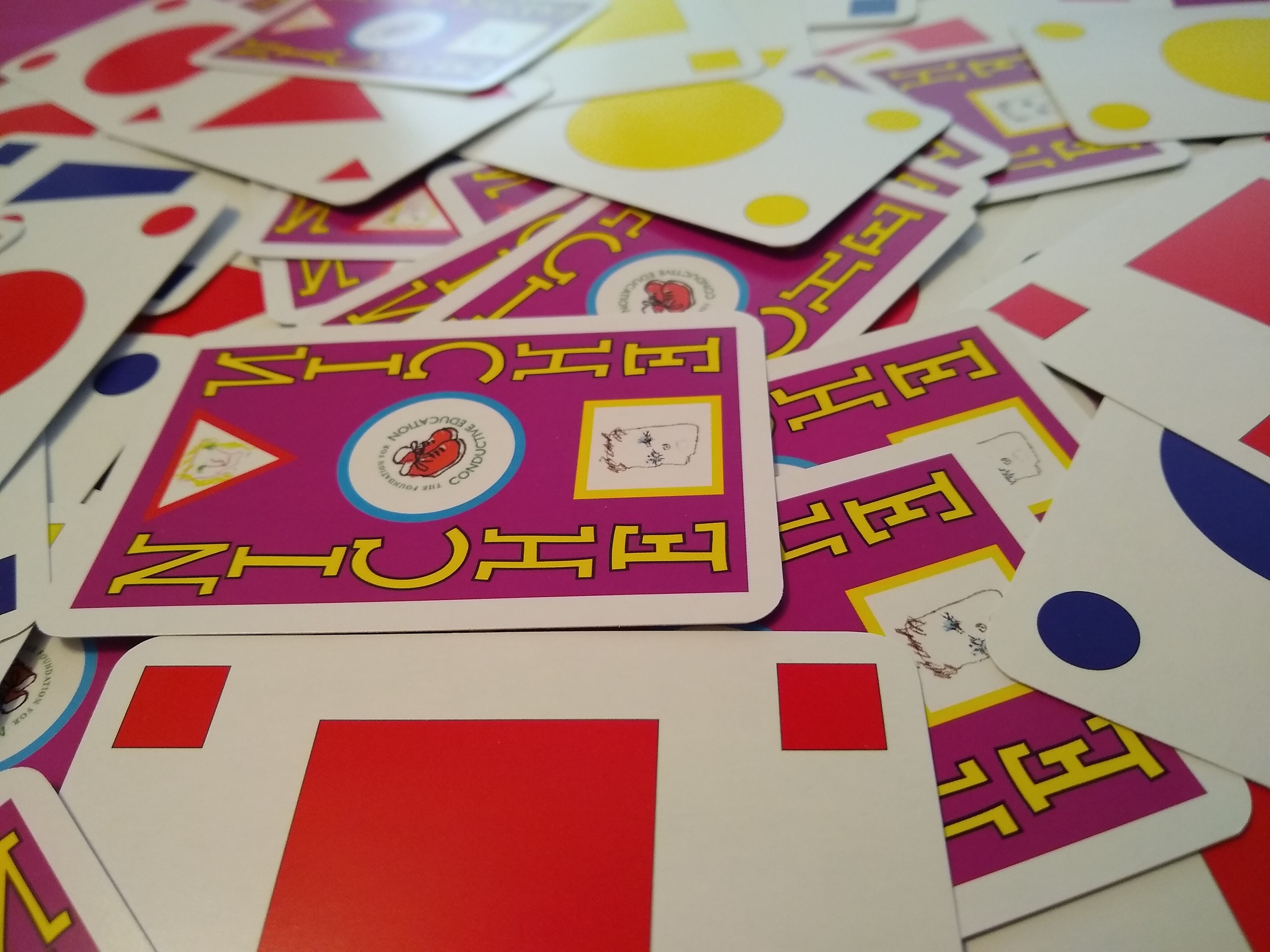 A simple card game where the deck contains cards of only 3 shapes/colors – red, blue, & yellow circles, triangles, & squares. Players take turns playing cards into the shared grid, scoring for each card in the row/column they place in. However, they can not play a card sharing any properties with the last card played, and each row/column can only have one of each card type in it. The game ends when one player scores their last card (everyone else gets one last chance to score as well) and the player with the most points wins! You can play one round or many as it’s very quick.