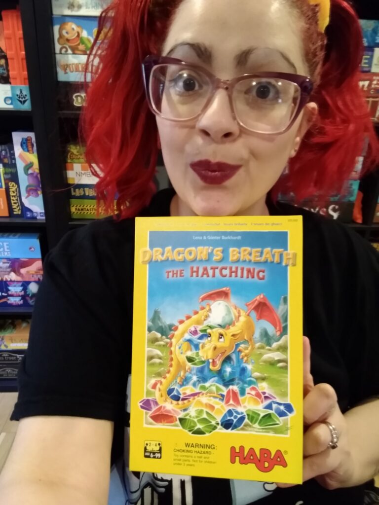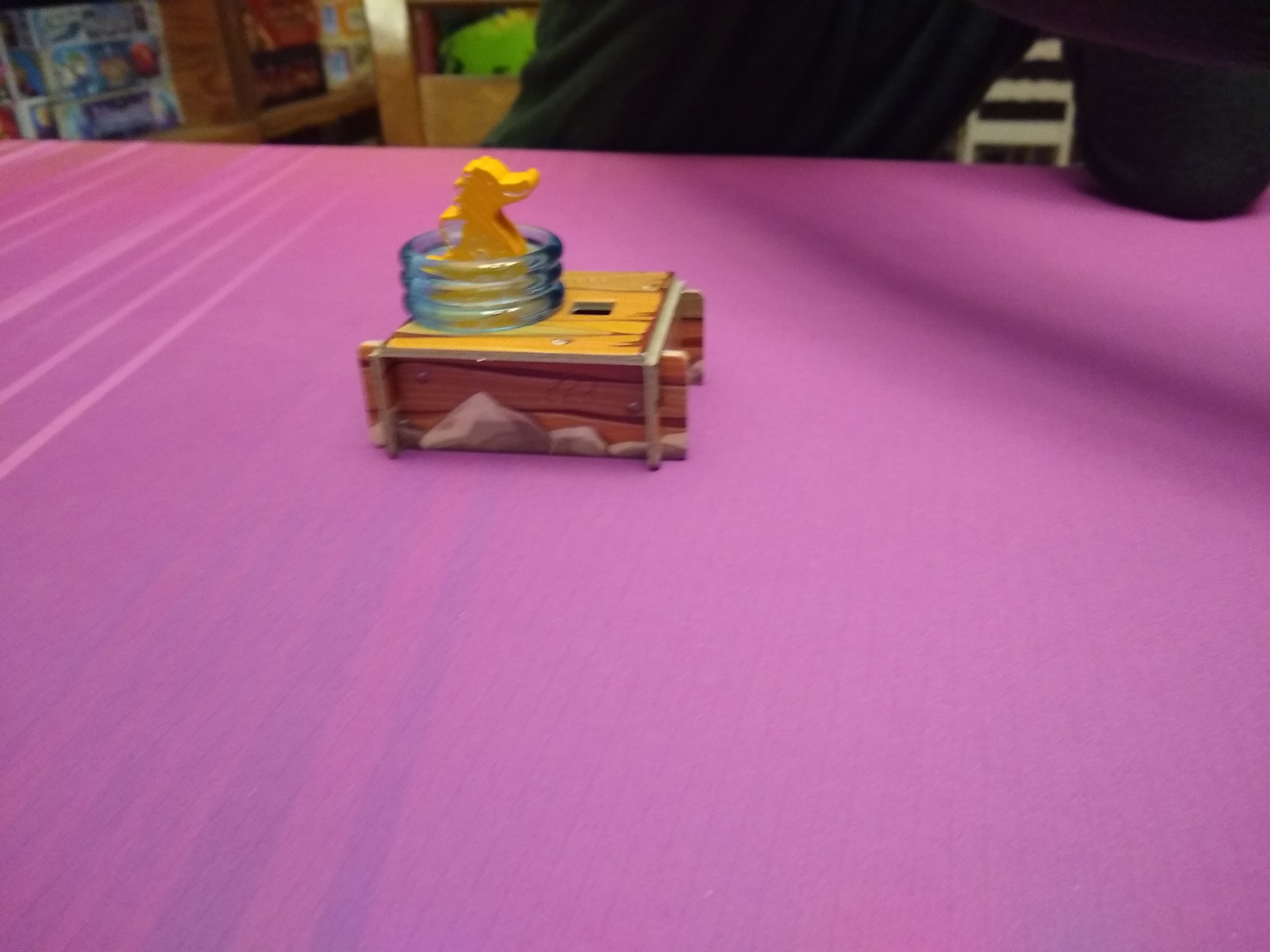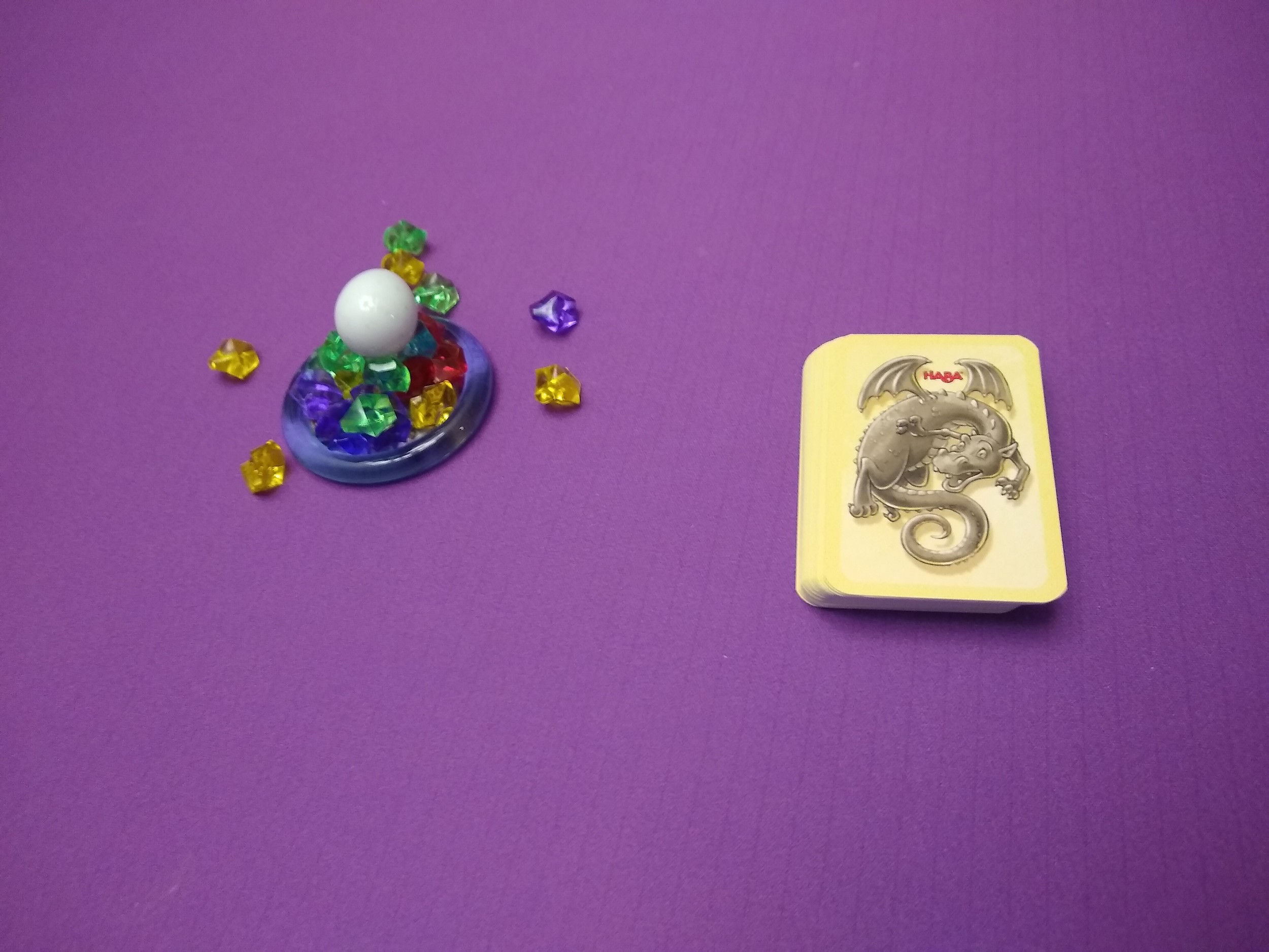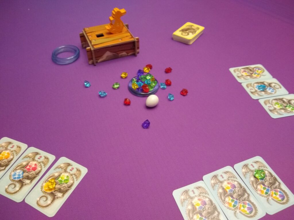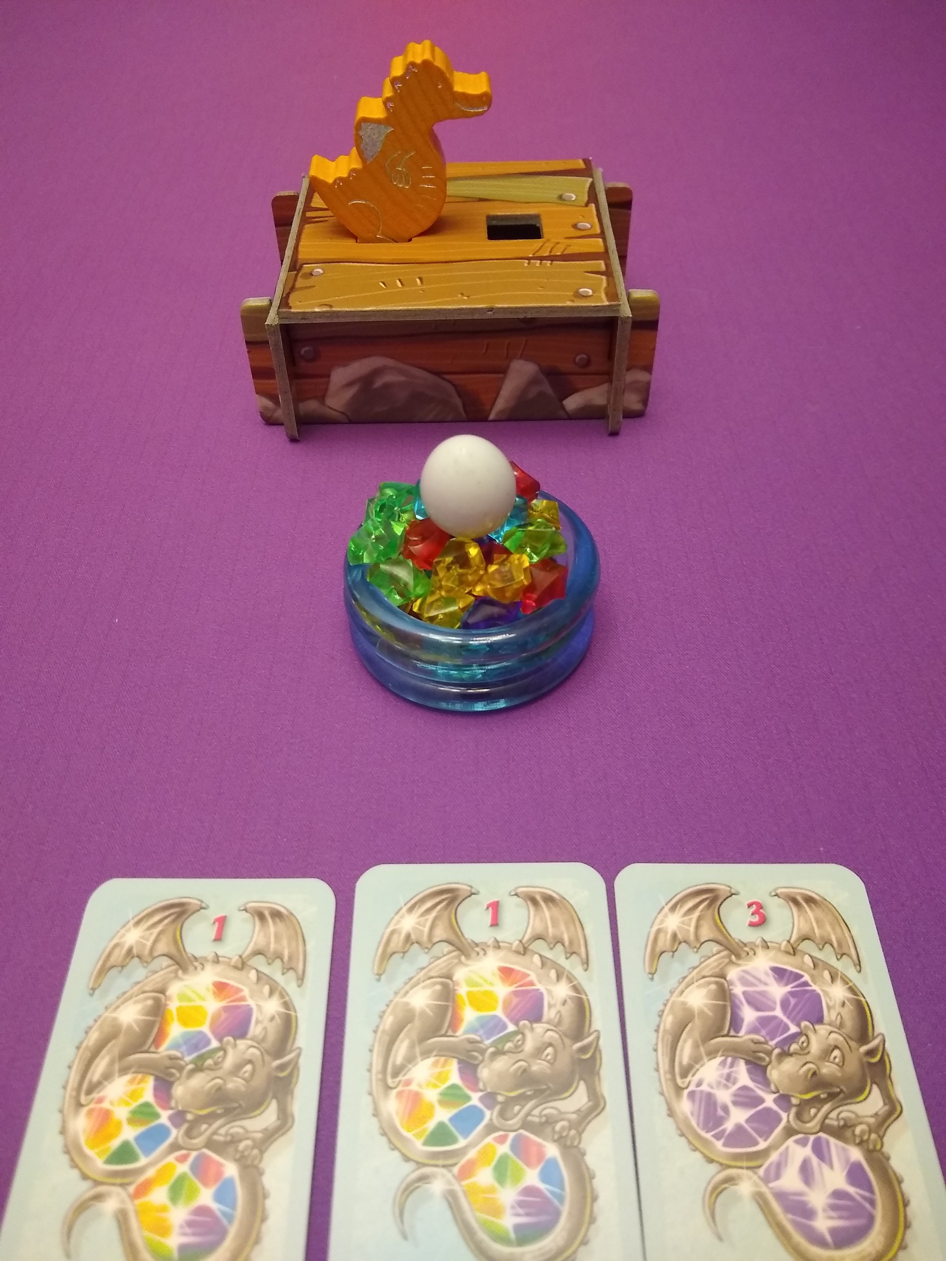 Drafting / Set Collection – Non-fire breather players take turns collecting 1 gem at a time from those that fell off the stack and putting them on matching spots on their amulets. The fire breather will also take a turn drafting stones, putting them in the treasure chest to keep them away from the other players. They will get to draft 2 on their turn, unless they dropped the egg, in which case they will only get 1 each turn.