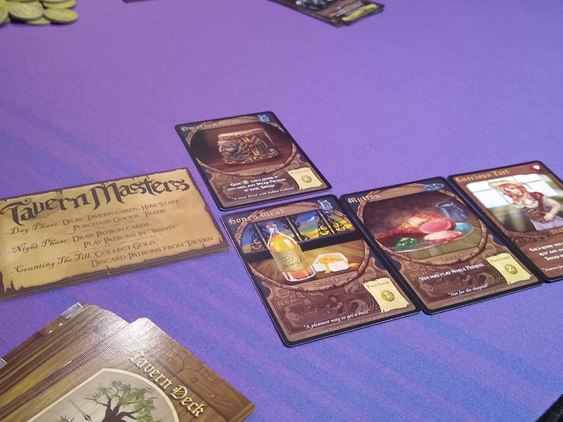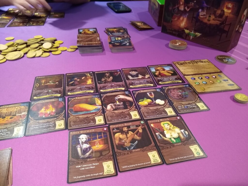 Tavern Masters is a tableau building game where players purchase goods and hire staff to stock their taverns and generate interest among the locals. They need to have what the patrons want to get them come in, and have what they like to get them to stay.