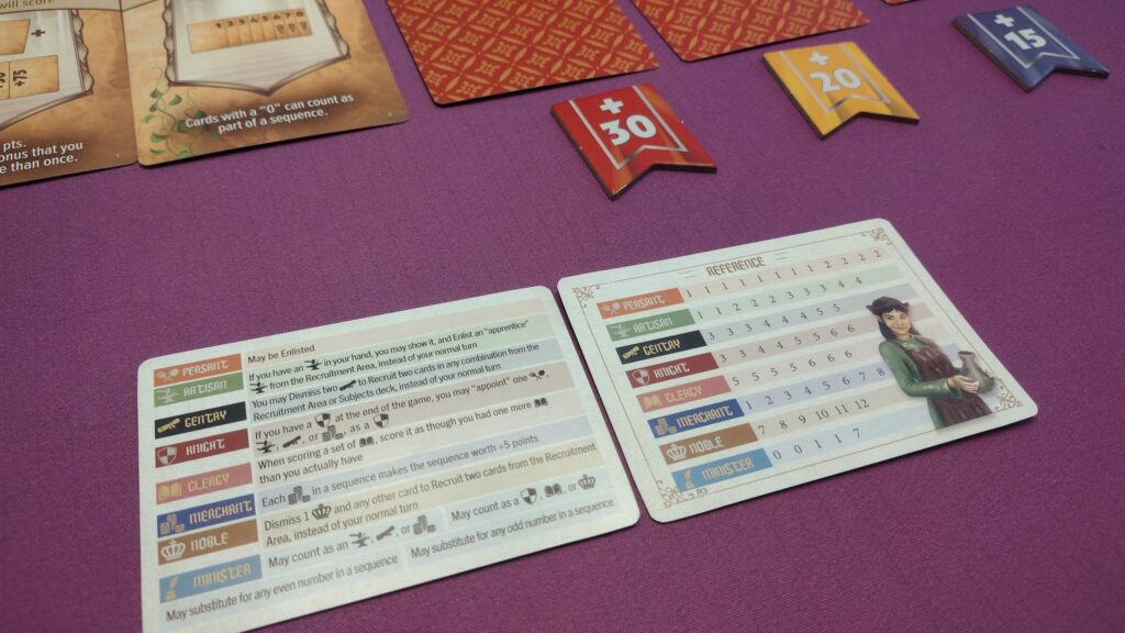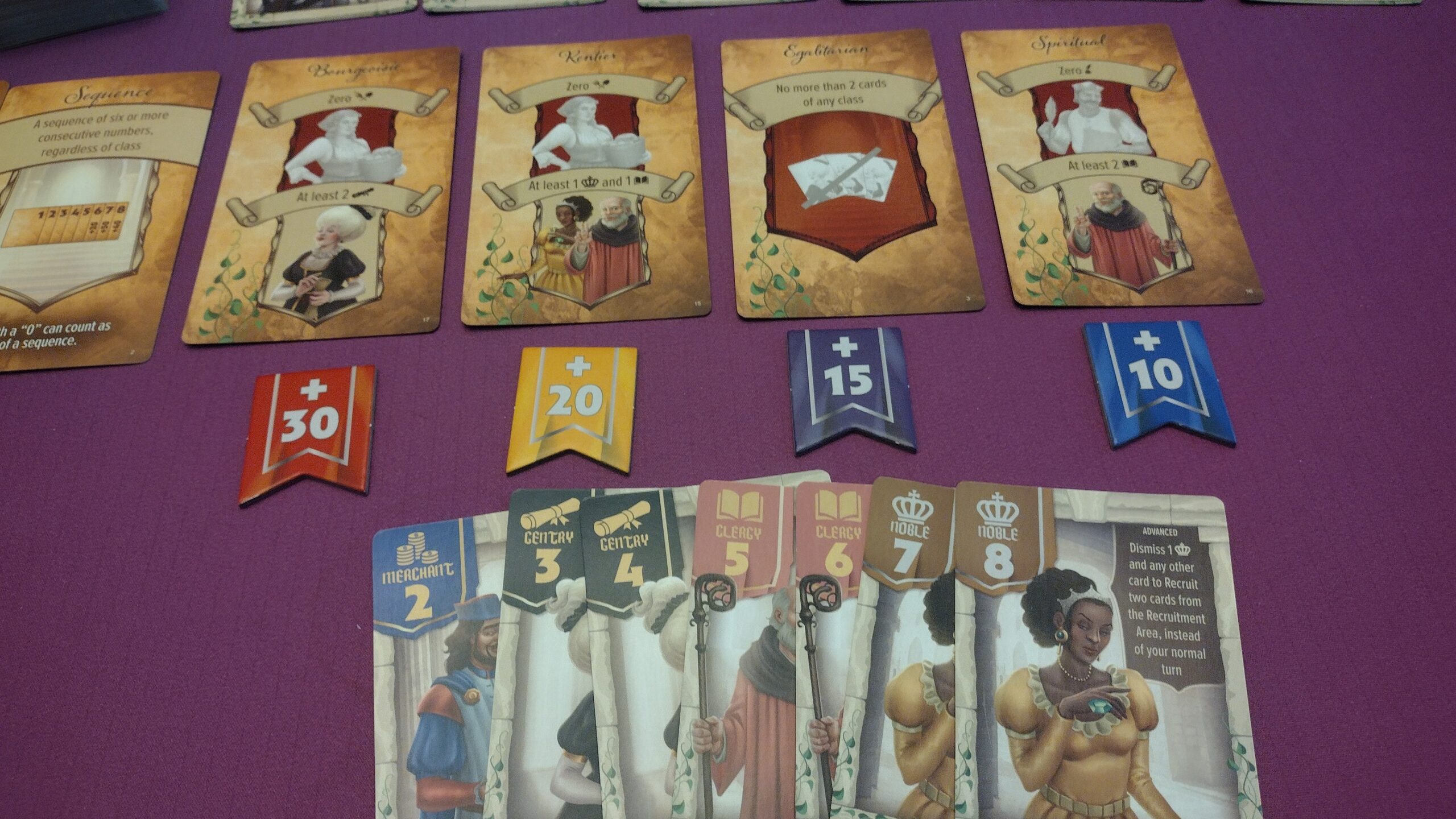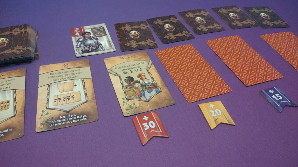Set Collection – In every game players can score for having sets of the same class of cards, and a sequence of consecutive cards. There are also 4 other scoring cards each game that are revealed over the first 4 rounds which will ask players to have (or not have) various cards/sets