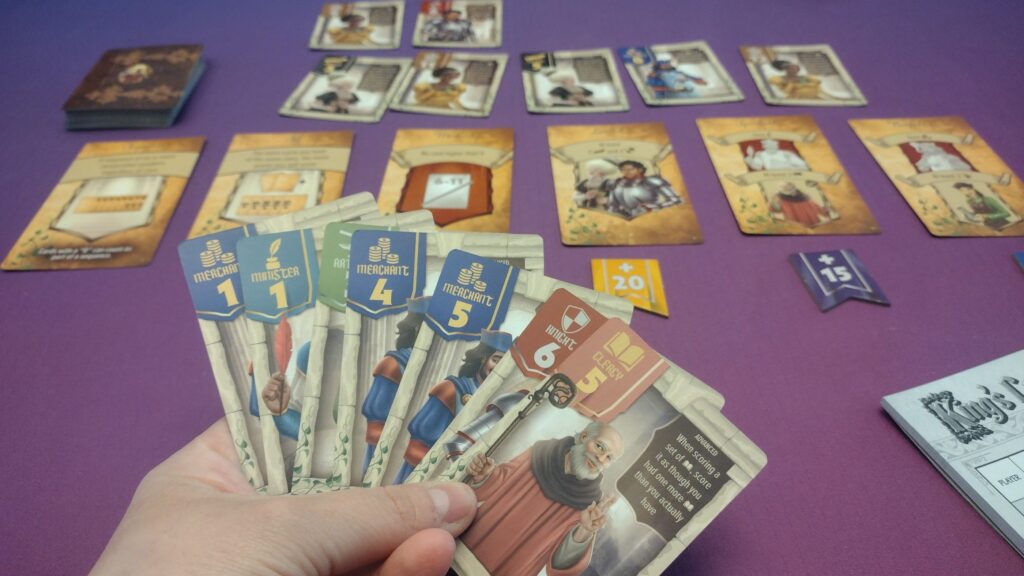 This game felt a little bit to me like Fantasy Realms, where you’re swapping cards in and out of your hand, trying to optimize your scoring opportunities. Still, this felt unique because the cards had some abilities, but the scoring objectives were shared by all players, so you were likely also paying more attention to what your opponents were picking up and tossing out.