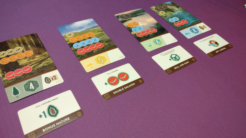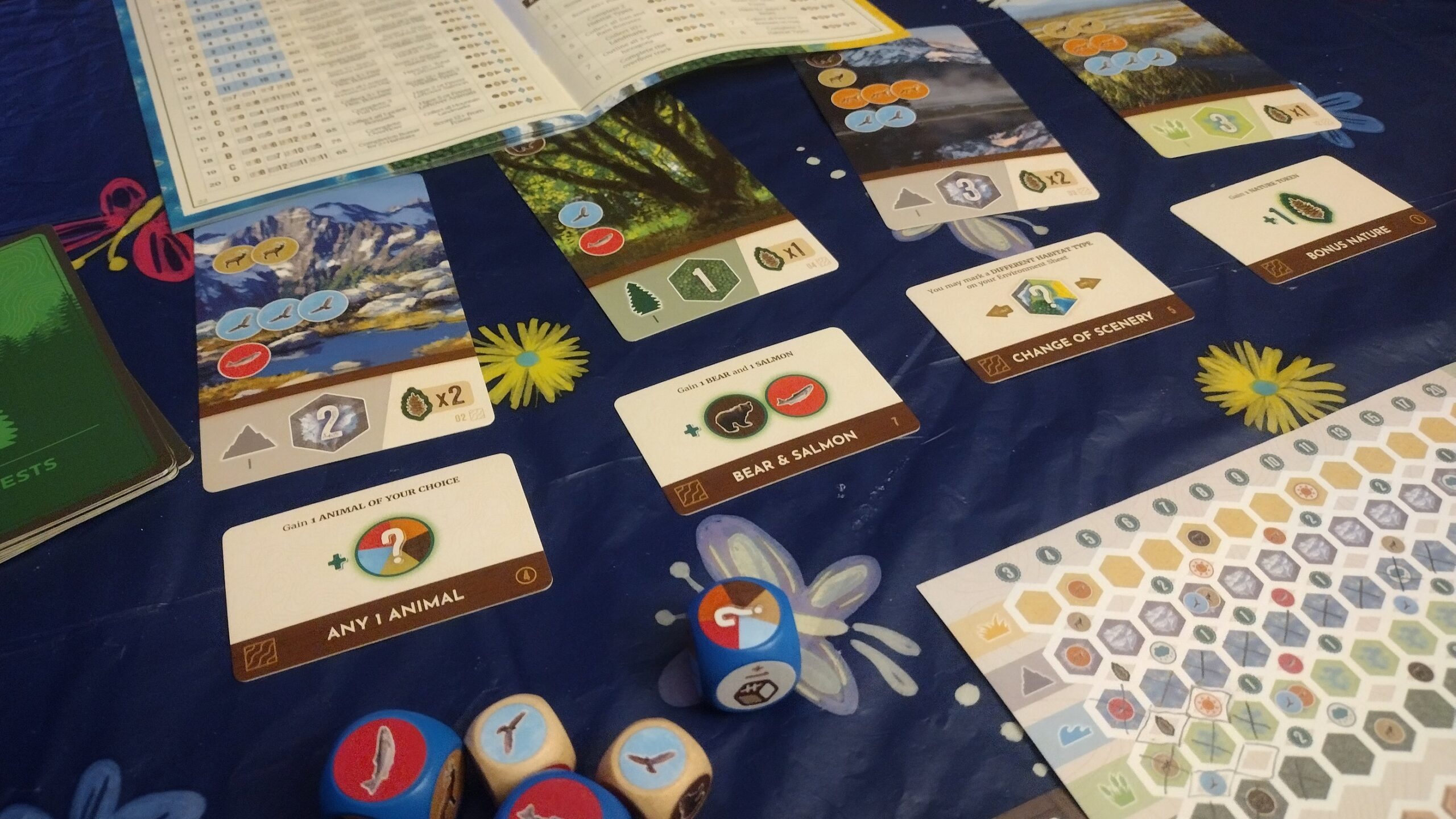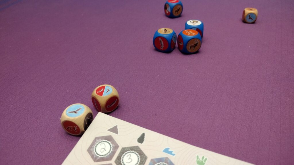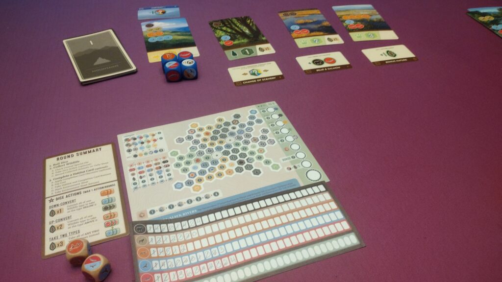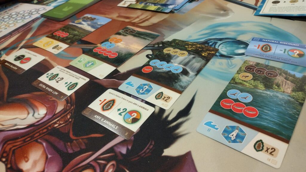 Resource Management – Players have to manage their wildlife, as they don’t know what they’ll need for future habitat cards, and their nature tokens, to be able to manipulate dice through dice actions.