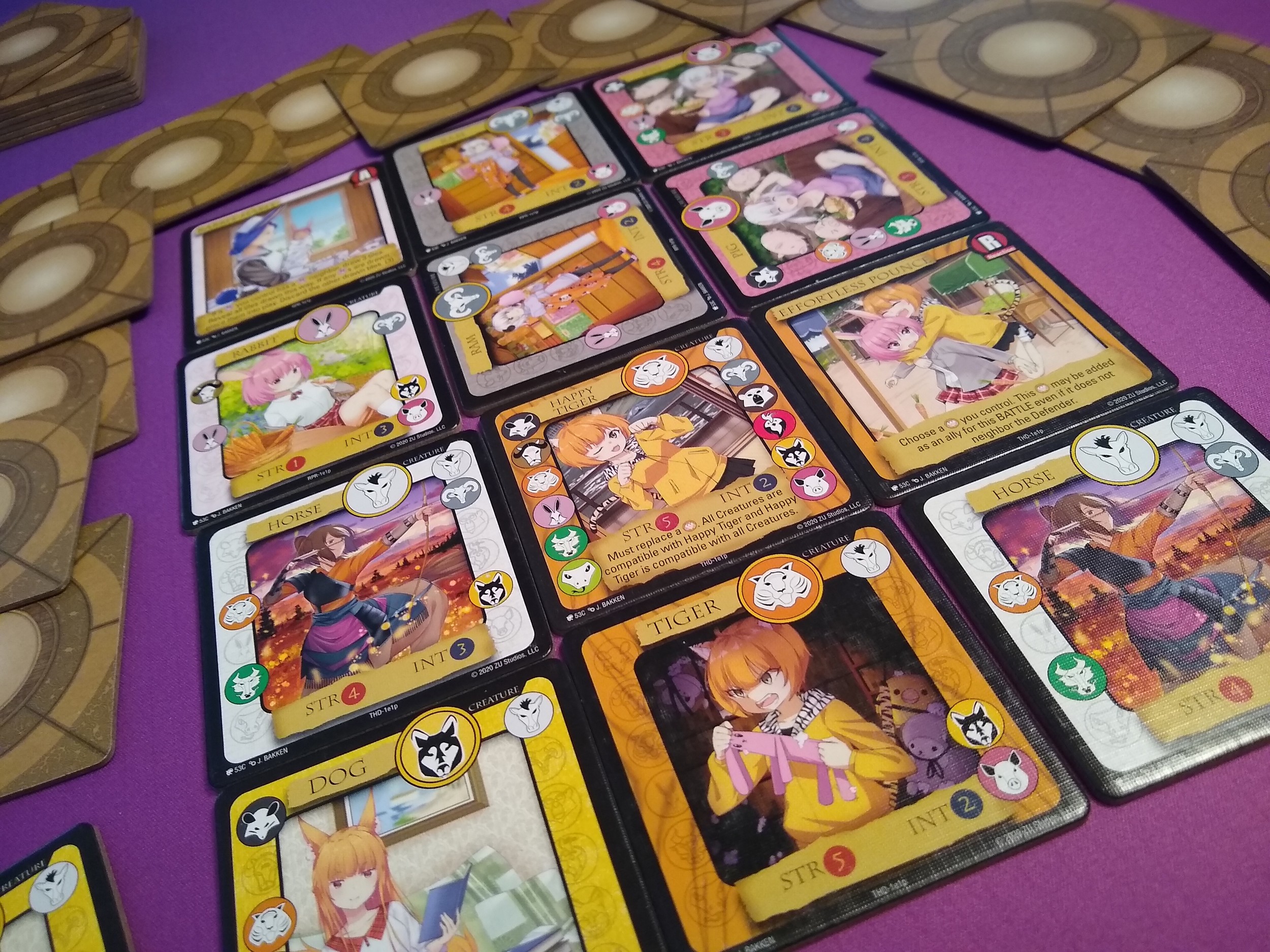 The tiles are really nice quality, very thick, and have adorable, colorful art. The compatibility symbols on tiles are clear and easy to see and most text is easy to read, but some can be a bit small on the action and reaction tiles. The rules are well written, pretty easy to learn from overall. They’re black and white, which was surprising, since everything else is very colorful, and it just made some of the examples a little harder to look at while learning. Finally, the box (this is for Starter Set 1 specifically) is a perfect fit, no wiggle room, so you’ll need another storage solution if you want to sleeve the tiles or buy more tiles in the future. Speaking of sleeves, I was also provided with some Zu Tiles sleeves, which are really nice quality and a perfect fit for the tiles.
