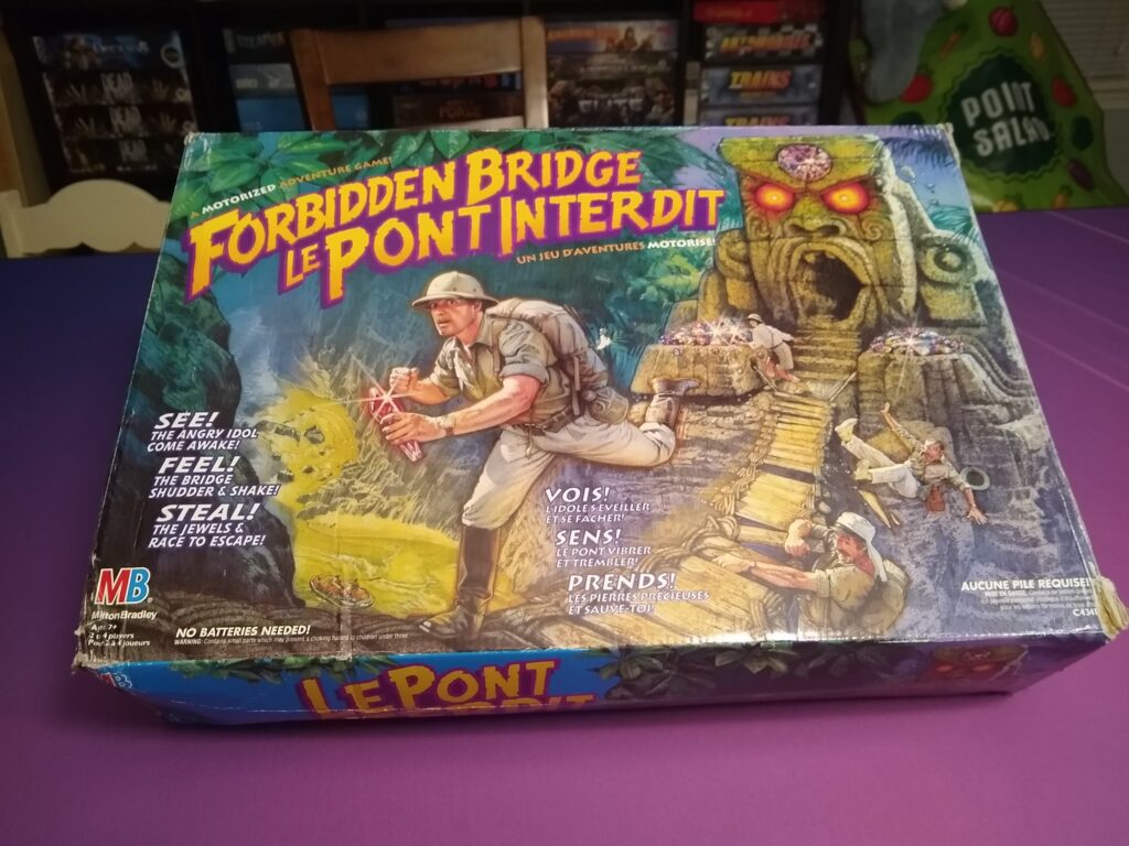 Despite a lot of text on my copy (since it’s the English/French version, so it has everything in both languages) the cover screams “adventure!” It’s another that really depicts what the game is about, and gets you excited for what’s inside. (An awesome mechanical bridge!)