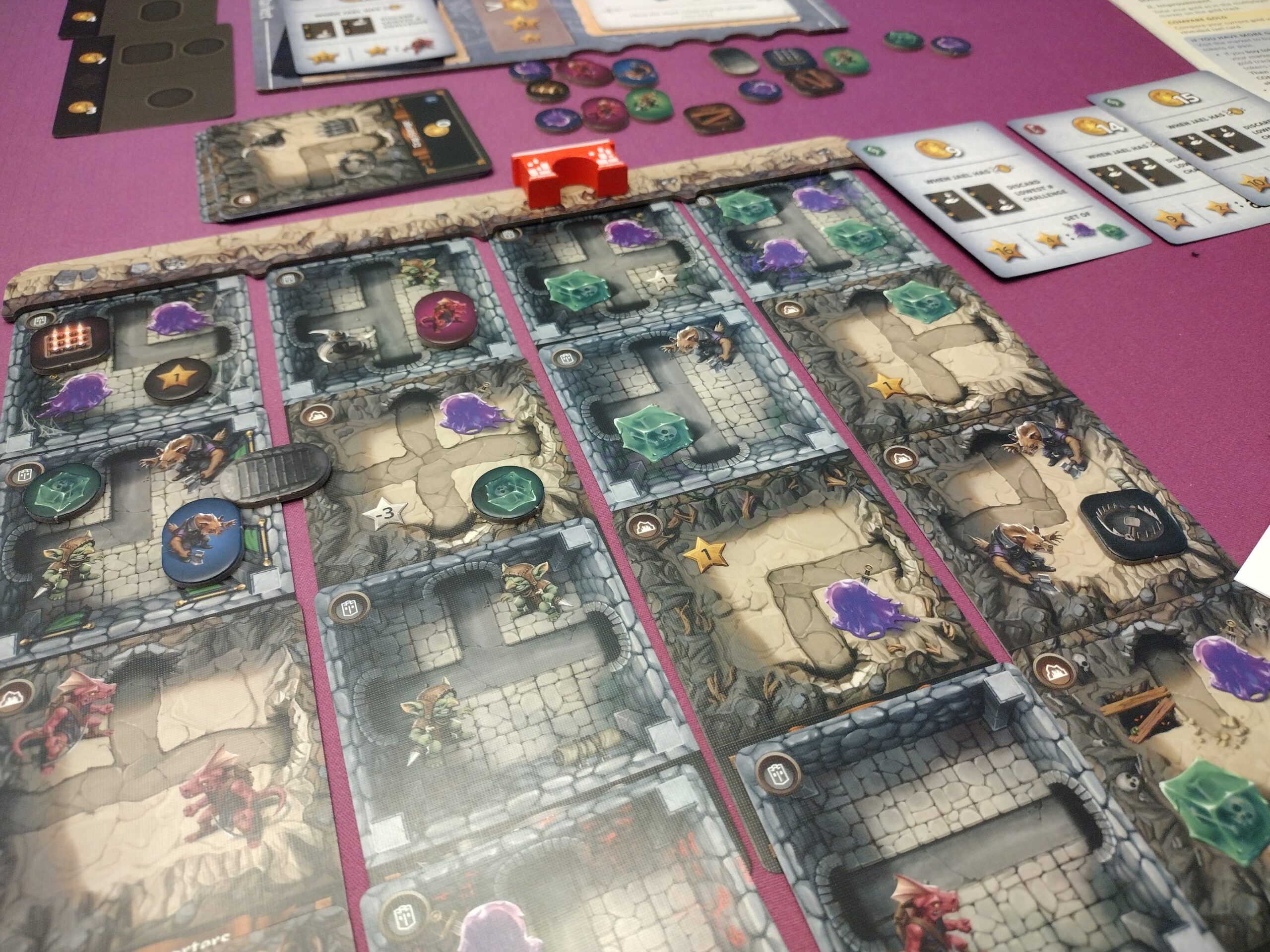 This one has players making a dungeon and you can score points for connecting paths, finishing your blueprints, and various challenge cards you pick up each round. I like that you aren’t forced to connect paths, because it helps alleviate some of the luck of the cards (though, so does drafting). I think it works really well, and it has a unique vibe to it.