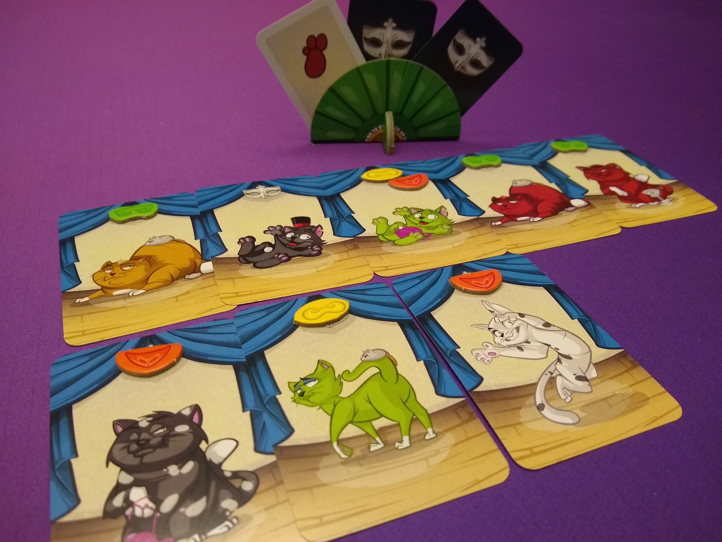 A deduction game where players are trying to figure out the 3 features of their opponents. Each turn players add a cat card to the table and all players add a mask of their color to the card if any of their features match that cat.