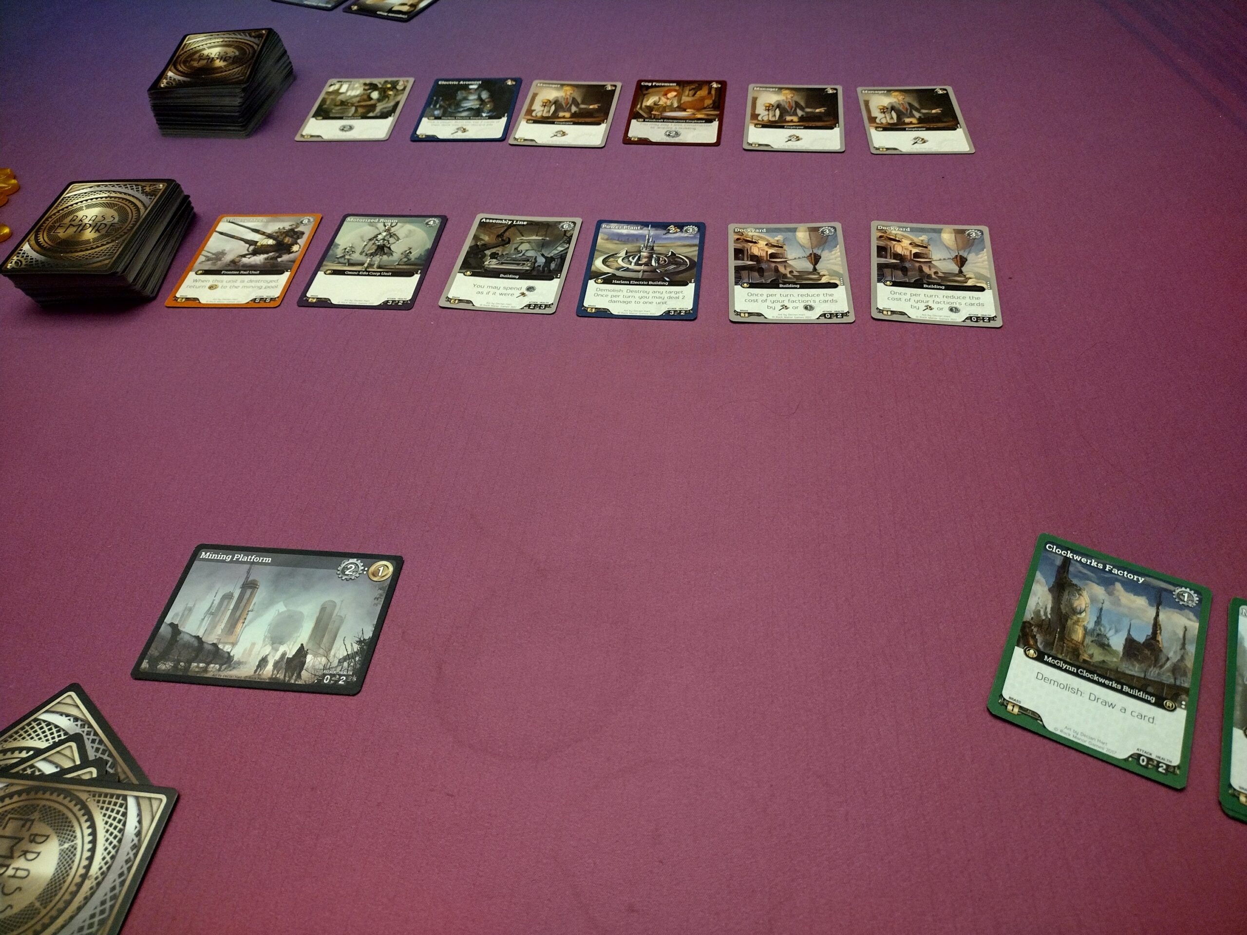 BATTLE – Each player starts with 20 brass as their economic health. When a unit/building is attached, you lose that much brass, instead of gaining it as points like you normally do. You can’t mine in this version, but if cards generate brass, you can heal. If you run out of brass, you’re out, and the last player standing wins. — This is definitely an interesting take on the game, and really lets you change up your strategy, especially if you normally go heavy into mining. Generally a little bit quicker as well, so it works well to vary the game.