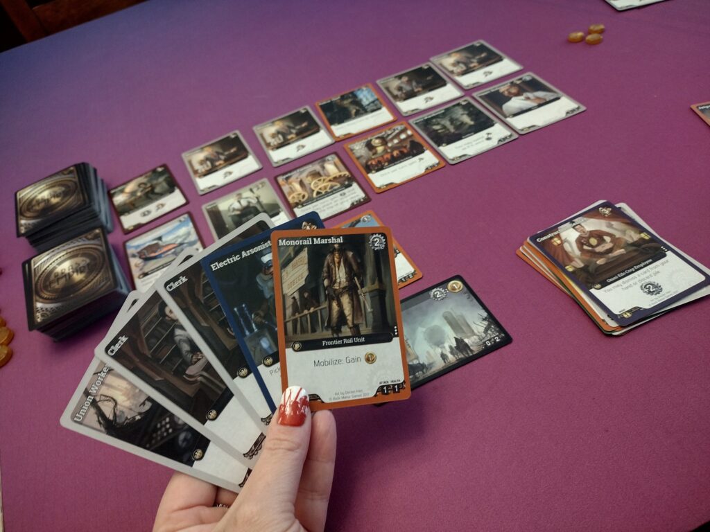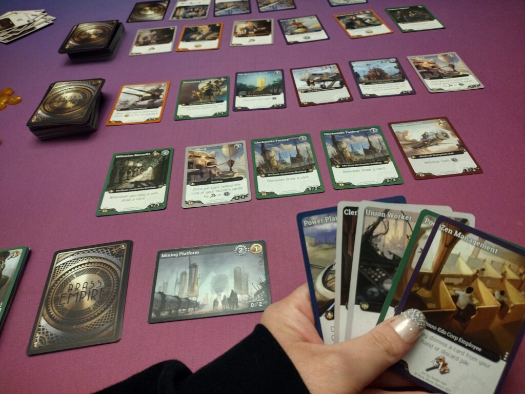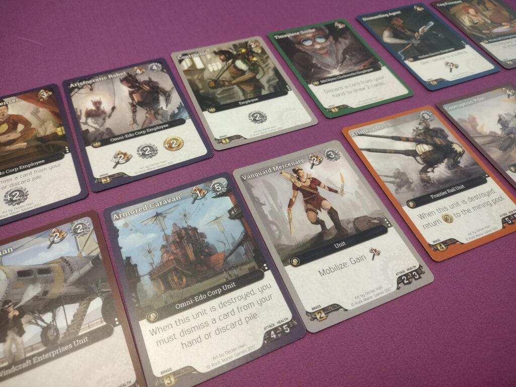 Overall, I really like Brass Empire! While, at it’s core, it is a very straightforward deck builder, I think the different factions elevate it and I feel like that’s where the variety for strategy lies, and it’s fun to try different combinations of cards to see what works. I also like the balance of focusing on mining versus attacking opponents, and I think both are viable strategies to get a win. The theme isn’t standout in the game, but if you like steampunk, some of the art is still cool.